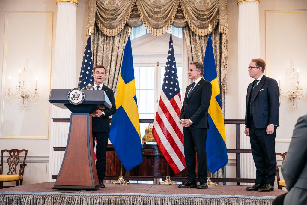 Bild från när Sverige gick med i Nato på torsdagen. Till vänster står Ulf Kristersson. Foto: Tom Samuelsson/Regeringskansliet